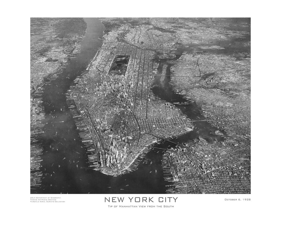 This stunning image taken from high altitude on a clear day shows busy ship traffic on the Hudson and East Rivers. It was taken in the middle of the skyscraper building boom of the late 1920s and early 1930s, but before many of the landmark buildings of Manhattan were built. The large rectangle of Central Park is clear in this image. The Brooklyn, Manhattan, Williamsburg, Queensboro, and Hell’s Gate Bridge sare seen spanning the East River. The Triborough Bridge was not started until 1929. On the Hudson, the George Washington Bridge was started in 1927, but it was not opened until 1931. The Little Red Lighthouse, where the GW Bridge now touches Manhattan, can be seen in this image.