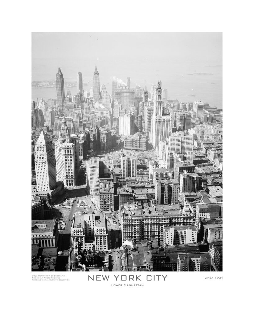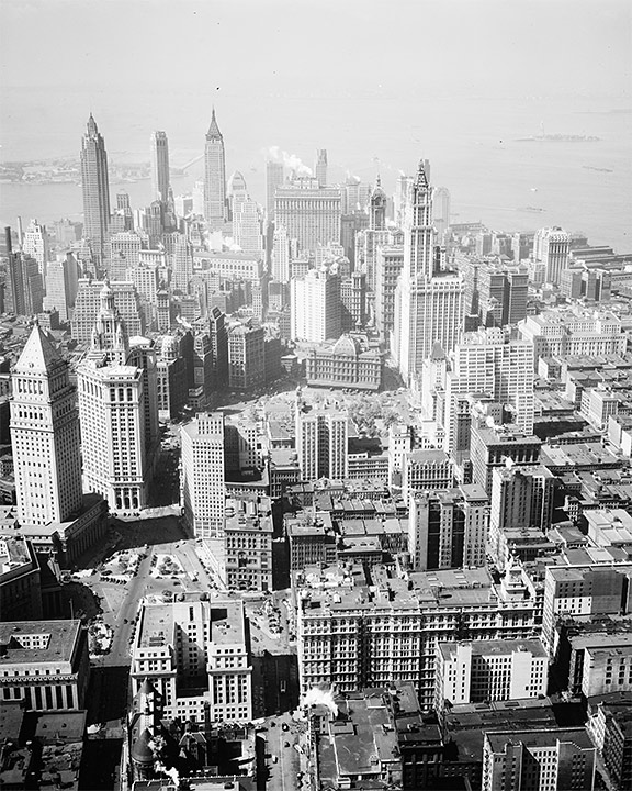 This beautiful view shows some of the most iconic buildings making up Lower Manhattan’s skyline. Foley Square/Thomas Paine Park is in the lower right of the image and City Hall Park is in the center of the image, with City Hall and the Tweed Courthouse just below them. The domed building on City Hall Park is the City Hall Post Office and Courthouse, which was demolished in 1939 with the space used to extend the park toward the south into its current triangular shape. From Left to Right across the image can be found the Bankers Trust Building (14 Wall St.), the Manhattan Municipal Building (1 Centre St.), 60 Wall Tower (70 Pine St.), the City Bank-Farmers Trust Building (20 Exchange St.), the Manhattan Trust Building (40 Wall St.), the Trust Company of America Building (37 Wall St), the Continental Bank Building (30 Broad St.), the Equitable Building (120 Broadway), the Bank of New York Building (1 Wall St.), the Singer Building (149 Broadway, demolished 1968), and the Woolworth Building (233 Broadway). The Statue of Liberty can be seen in the distance on the top right of the image.